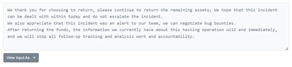 资金被盗后又被归还或许将成为一个新趋势。无论是给予赏金还是以合理谈判的方式拿回被盗资金,主要有两种传递消息的方式:一个是在项目方媒体平台发声,另一个则是攻击者与项目方通过链上留言进行沟通。