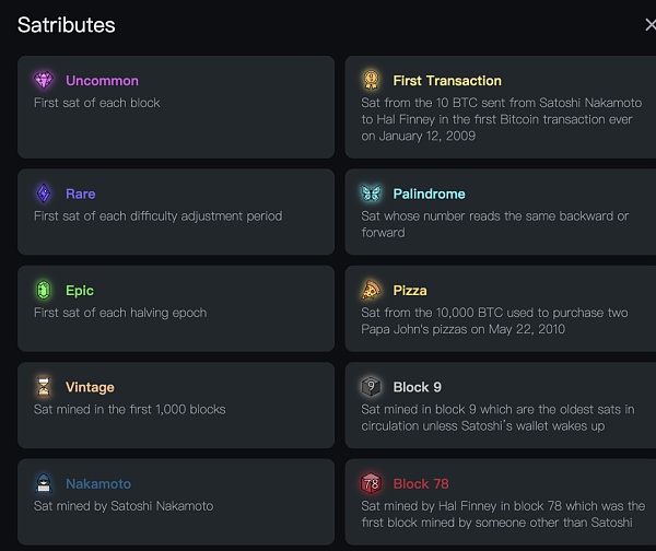 因为Ordinals的大热,作为铭文(inscription)载体的聪自然得到了有心人的关注,稀有聪相关概念应用而生。