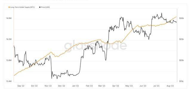 我们常用持仓超过155天没有换手的BTC数据来衡量长期持有BTC的走势,截止到今天,仍然可以看到更多的BTC还是在向着长期持有的方向移动,目前已经有1,464万枚BTC在最近的五个月中没有参与过换手,占了流通总量的75.23%。算算时间应该是在3月中旬了,这个时间是硅谷银行爆雷附近,当时并不知道三个月以后贝莱德会去申请ETF,所以当时开始买入并持有到现在的投资者更多的要么是在博弈美联储进入到暂停加息周期,要么就是以减半大周期作为目标。这部分很有可能是以机构和高净值投资者为主,并不在意短期的价格波动,即便是在六月短暂的跌破26,000美元,跌破了他们的成本价也没有让他们离场。