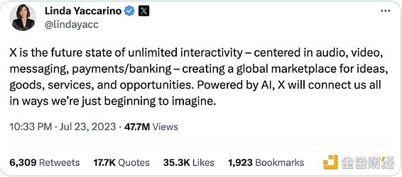 “新推特X”首席执行官Linda Yaccarino已经表示,“在人工智能计划的支持下,X将以难以想象的方式将所有人联系起来。”