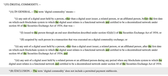 该协议明确了商品期货交易委员会(CFTC)和证券交易委员会(SEC)的加密货币监管角色,赋予商品期货交易委员会(CFTC)对数字商品(Digital Commodity)的园区权,包括数字商品相关的交易所根据联合发起人公布的票据情况说明,大约70%的加密代币更适合被视为商品而不是证券,即70%的代币应该是曼哈顿应该由商品期货交易委员会(CFTC)管辖,并指出仅凭投资合同不能将代币归类为证券。以下是该法案针对数字商品(数字商品)的定义可以发现数字资产(数字资产)被视为数字商品(数字商品)的主要条件是去中心化和关联网络的功能性。