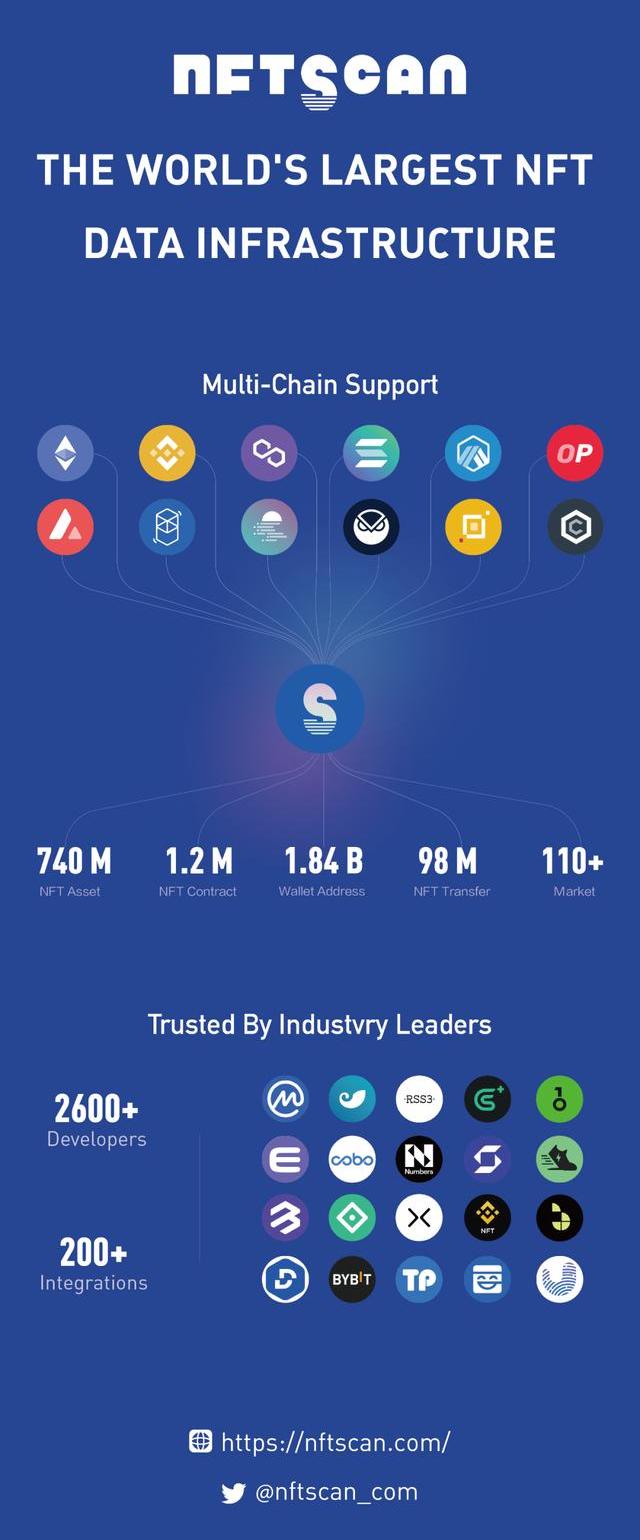 NFTScan是亚洲地区最大的NFT数据服务商,目前已支持Ethereum、Solana、BNBChain、Polygon、Avalanche、Arbitrum、Optimism、Fantom、Moonbeam、PlatON、Cronos、Gnosis12条区块链。除了http://NFTScan.COM多链浏览器产品外,NFTScan旗下设有Web3开发者平台,为开发者提供专业的NFTAPI数据服务。NFTScan目前服务了200+Web3项目,其中包括CoinMarketCap、Safepal、Mask、imToken、CyberConnect、RSS3、BitKeep、DefiYield、Kucoin、OneKey、Cobo、Bybit、Enjin、Stepn等知名区块链项目。