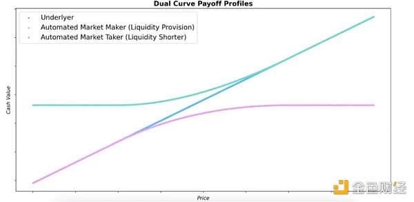 与依赖 Uniswap V3 AMM 创建多头 / 空头期权的 Panoptics 不同,Itos 通过在正向流动性提供之上建立自己的集中流动性 AMM(CLMM),利用负流动性提供头寸(称为 takers),提供类似的产品。AMM 结构有三个市场参与者:maker、taker 和 trader。在 Uniswap V3 中,maker 和 trader 是相同的概念,maker 指的是将可互换的代币对存入流动性池的流动性提供者,trader 指的是在流动性池中交换一种代币以换取另一种代币的参与者。与 maker 提供流动性不同,taker 保留流动性以进行交易。这些 taker 始终与交换进行交易,支付费用以确保交易进入更有价值的代币。这使得可以创建类似看跌期权和看涨期权的 TakerPuts 和 TakerCalls。例如,在去中心化交易所(DEX)上发生交易时,taker 通过参与该交易获利,同时支付资金费率以确保有足够的流动性执行交易。通过始终利用每一笔交易,他们的头寸价值随着价格的变动而增加,而市场做市头寸的价值往往会下降。因此,这使得 taker 可以体验类似多头期权的回报函数(如下图中的绿线),有效对冲任何 maker 头寸。