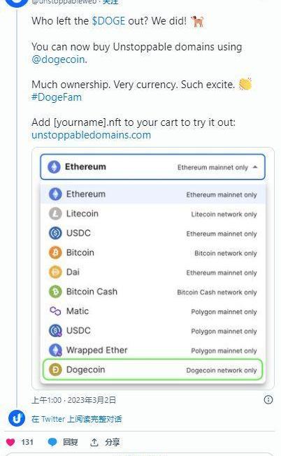 三月开始对狗狗币来说是个好消息。UnstoppableDomains现已加入世界上最大的表情包硬币作为支付选项。