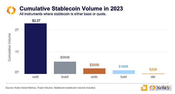 从另一个角度来看,2023 年稳定币累计交易量将超过 3 万亿美元,其中 Tether 占据主导地位。