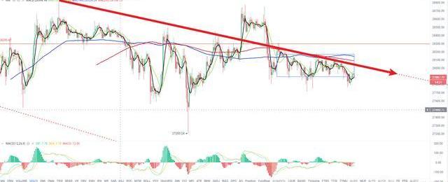 昨天大饼BTC高点为29870.22点,收于28170.64点,振幅为6.05%,跌幅为5.011%。昨天主要走势处于下跌,收盘价位于5日线下。中长线来看空方力量主导.