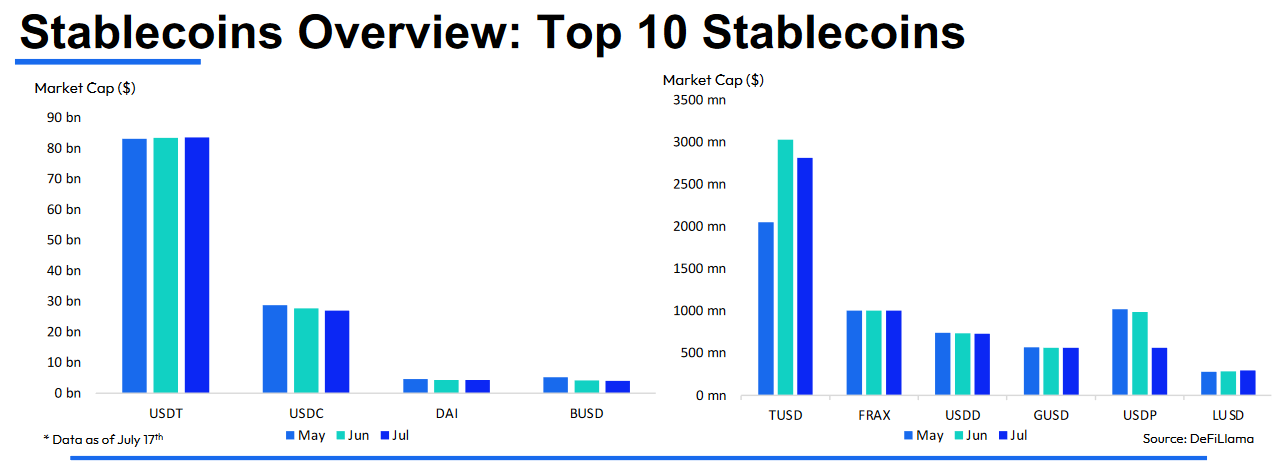 包括 Dai (DAI)、Frax (FRAX) 和 USDD (USDD) 在内的去中心化稳定币市场 7 月份的市值增长了 0.43%,达到 75.2 亿美元,这是自 2 月份以来的第一个表现积极的月份。 然而,其市值仍较 4 月份创下的 343 亿美元的历史高点下降了 78.1%。