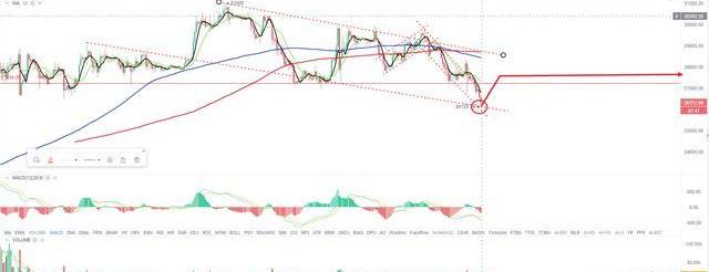 今天大饼btc也是非常弱势,一直在破新低,来到了4h下降通道的下边缘线,同时也是30min下降通道的下边缘线,显然这里发生共振,从技术层面来说,这里必然要反弹,至于反弹的力度是多少?大致分为一个是30min的2.68w和4h的2.73w附近。因为日线上还是空方主导,如果今天晚间反弹力度很小,那么很有可能继续跌,只能说是相对日线的小级别,这里的多方盈亏比很好,做好止损即可。今天下跌确实有点让人恐慌的节奏,正因为买点永远是下跌时候形成,带好止损,拒绝恐慌。