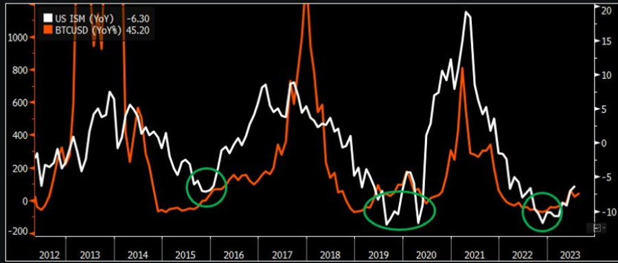 正如 ISM 制造业指数所示,该研究揭示了比特币价格峰值与商业周期变化之间存在着令人着迷的相关性。