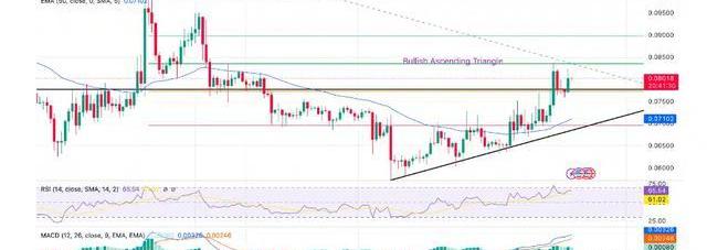 狗狗币(DOGE)价格在形成上升三角形后从0.07美元区间上涨至0.08美元。此后,它继续表现出有趣的价格走势。在成功飙升至0.084美元后,多头无法维持这一价格上涨,因为DOGE价格从0.084美元跌至0.077美元。价格保持在该区域之上,使得多头有兴趣建立多头头寸。山寨币价格目前交易于50日均线上方。这表明价格趋势看涨。它还表明DOGE的价格确认比MACD和RSI更多,表明强劲的上升趋势。DOGE要想有机会上涨至0.15美元,价格必须上涨并保持在0.095美元以上。