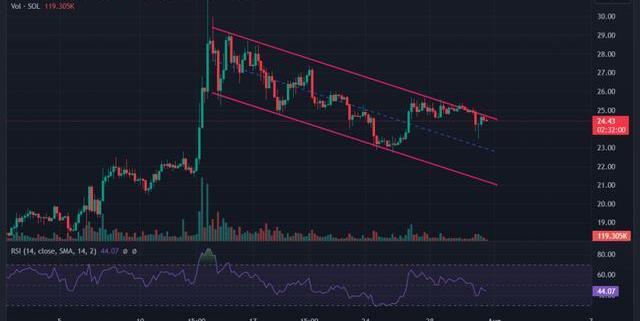 4小时图显示了下降平行通道模式,这是一种常见的看涨模式,通常会导致突破。然而,价格被通道阻力所拒绝,4小时RSI显示空头控制了市场。因此,SOL可能会跌向通道中线22.7美元,并可能跌至通道支撑位21美元,然后在修正完成后尝试再次突破26美元区域。
