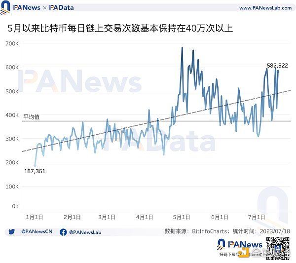 因此,很难将近期比特币价格的上涨归结于其中一个因素,除了BlckRock带来的利好消息以外,需要注意的是,近期比特币链上交易次数受到BRC-20代币兴起的影响也创下了历史新高。7月18日,比特币链上交易次数达到了58.25万次,较年初的18.74万次增长了210.83%。从趋势来看,5月以后,大多数时间的链上交易次数都在40万次以上,超过50万次也不少。链上交易次数是比特币应用情况的直观反映,通常而言,链上交易次数上涨意味着交易基本面改善,价格很有可能上涨。
