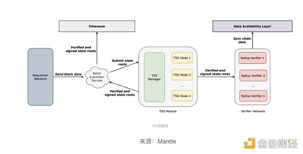 (2)门限签名方案:Optimistic rollup有一个限制,即以挑战起的形式对提款施加较长的等待时间,为了解决挑战期间交易验证的不确定性问题,Mantle实现了以分布式签名方案来验证区块数据。这种分布式密钥生成与数字签名相结合的范例更普遍地称为门限签名方案TSS,它使客户端网络的每一方都能生成有效的签名,并确保分布式签名数据的可验证性(*只要有足够多诚实的签名)。由于每个TSS客户端仅持有私钥的一部分,因此私钥也不再是单点故障。