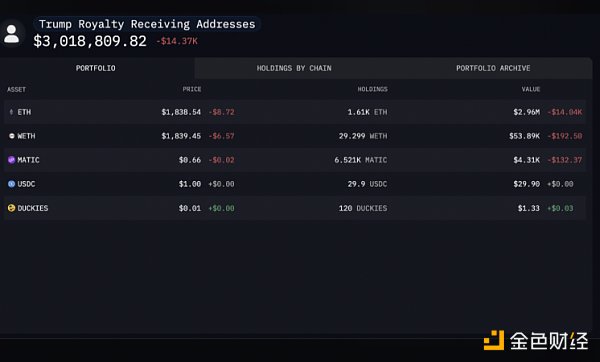 The Block Research 分析师布拉德·凯 (Brad Kay) 表示,在二级销售中收取的特许权使用费中,特朗普的两个系列 NFT 已赚取 260 万美元。 他说,获得这些收入的四个数字钱包目前持有价值约 300 万美元的以太坊。
