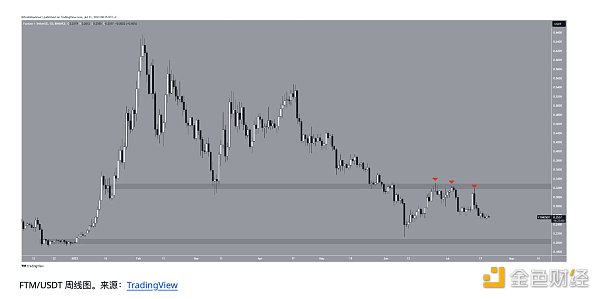 自6月25日$0.32的阻力区被拒绝以来,FTM价格一直在下跌。迄今为止,它已经形成了三个较低的高点(红色标记),表明上涨动能已经减弱。