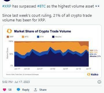 XRP占据所有加密货币交易量的21%