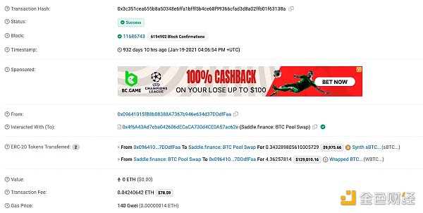 过高的期待也带来一些问题,在上线之初,流动性提供者蜂拥而至。由于 Saddle 和 Curve 的机制相同,一个池中包含多种同类资产,如果都用同一种资产添加流动性,会导致池中资产的比例和价格失衡,继续添加流动性的人会遭受很高的滑点。Etherscan 上的一笔交易显示,在 Saddle 刚上线时,某用户在 Saddle 的 BTC 池中用 0.34 sBTC 换取了 4.36 WBTC,这就意味着流动性提供者遭受了永久性的损失,而这样的套利例子在刚上线时很多。