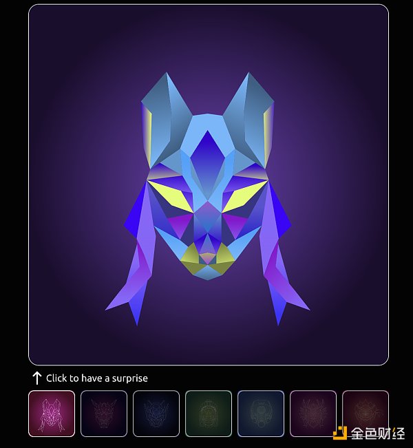 算法部分的基本原理在于将用户钱包地址作为种子,运用随机函数创造多种不同的颜色组合,以用来为面具模型上色。
