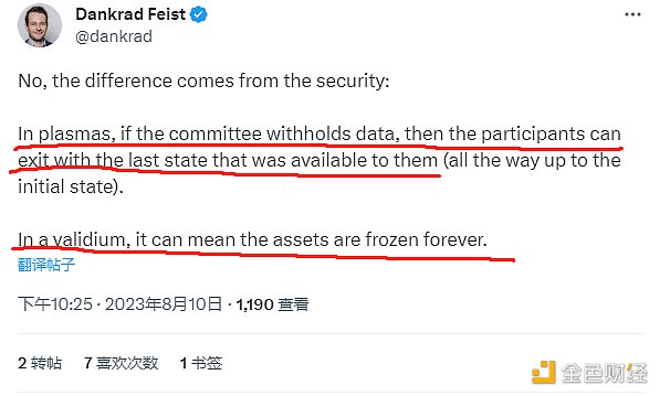 对此,Dankrad表示,Plasma用户在DA不可用时(就是指链下的DA层网络搞数据扣留,不公开交易数据),仍然可以把自己的资产安全撤出至L1;但相同的情况下,Validium(大多数采用StarkEx方案的项目都是validium)却可以让用户无法撤资至L1,把钱冻住。