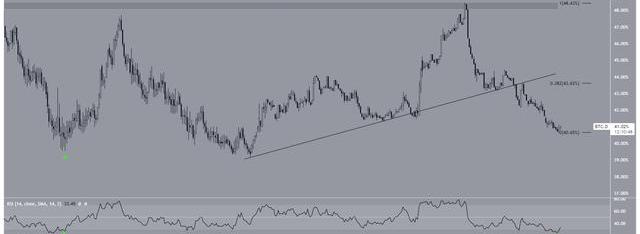 六小时图表也支持反弹的可能性,该图表显示BTCD在下降楔形内交易,并在RSI中产生了看涨背离。从楔形突破将证实短期向上运动已经开始。