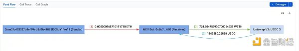 该交易是由 MEV 机器人插入的,以 swap 724.6 WETH 为 1.34M USDC,目标交易之前,该交易是按 1857 ETH/USDC 价格进行的。