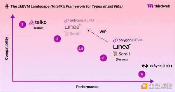 使用 Vitalik 的框架: → Taiko:类型 1 (测试网上线) → Polygon zkEVM:类型 3 (主网上线 + 计划迁移到类型 2) → Linea:类型 3 (主网上线 + 计划迁移到类型 2) → Scroll:类型 3 (测试网上线 + 计划转向类型 1) → zkSync Era:类型 4 (主网上线)