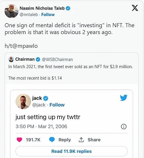 NFT市场波动性高并不是少见,2021 年,Twitter创始人Jack Dorsey的第一条推文的NFT售价高达290万美元,但据《黑天鹅》一书的作者纳西姆·尼古拉斯·塔勒布 (Nassim Nicholas Taleb) 分享推文显示,该NFT最新竞拍出价仅为1.14美元。