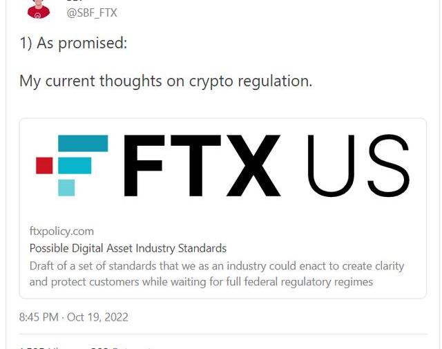 最后也是最重要的一点:FTX的首席执行官SBF最近发布了一个有争议的Twitter,提出了美国对加密货币的各种监管方案。