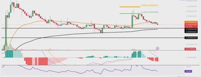 狗狗币离触及约0.00000183BTC和约0.000003BTC之间的支撑不远。狗狗币可能会再次反弹。还有200周的EMA,作为额外的支持。