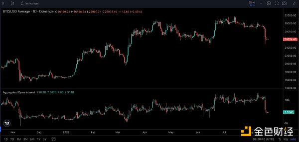 从 Coinalyze 上的下图可以看出,8 月 17 日,大部分期货未平仓合约被清空,导致多头头寸大量清算。加密货币的波动性在过去几周一直非常低,当这种情况发生时,随着波动性的回归,期货交易者会增加开仓利益,以押注市场的走势。当价格开始下跌时,大量多头仓位被强制平仓,进而导致更多仓位被清算,如此循环。因此,很难将最近的价格行动归因于任何特定的消息。此外,现货市场进一步出现大量抛售,这可能表明较大的参与者正在抛售头寸。
