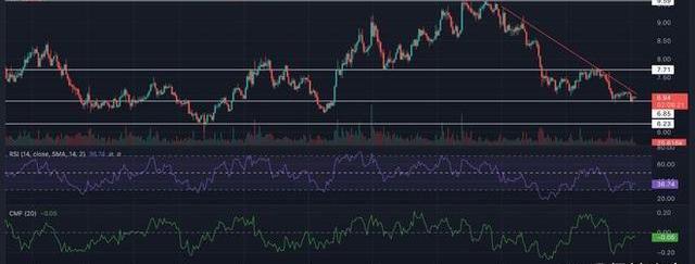在测试了9.59美元的阻力位后,价格完全下跌。截至发稿时,它正在测试6.85美元的支撑位。