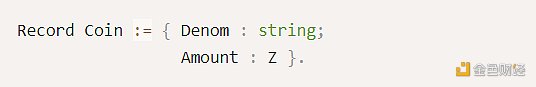 来源:https://docs.cosmos.network/v0.46/building-modules/msg-services.html验证方法如前文所述,本次验证的范围仅限于bank模块。验证开始前,我们首先对bank模块内的数据类型制定其形式化规范。例如,bank模块中有一个代币数据结构,其包含string类型的面额和big.Int类型的金额,在源代码中定义如下: