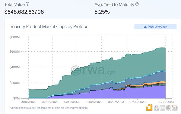 据 rwa.xyz 的数据显示,当前国债类的 RWA(不包含 MakerDAO 中的美债)项目,其代币化的国债资产为6.48亿美元,较年初增长约 230% 左右。