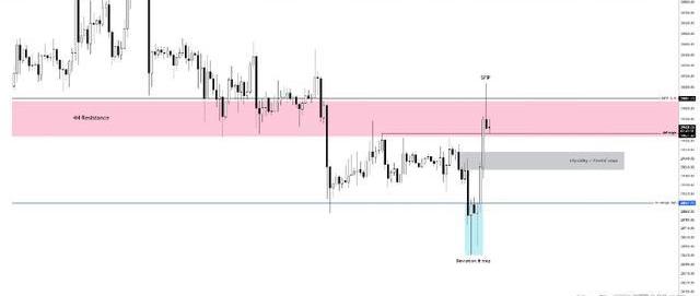不过,他也警告说,到目前为止,4小时图看起来像是进入更高时间框架支撑/阻力的经典波动失败模式(SFP)。波动失败模式是一种反转模式,交易者将止损目标定在关键波动低点上方或关键波动高点下方,通过产生足够的流动性来操纵价格方向。
