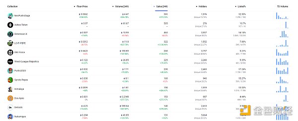 24小时NFT交易量、交易量前十项目 数据来源:Coinmarketcap