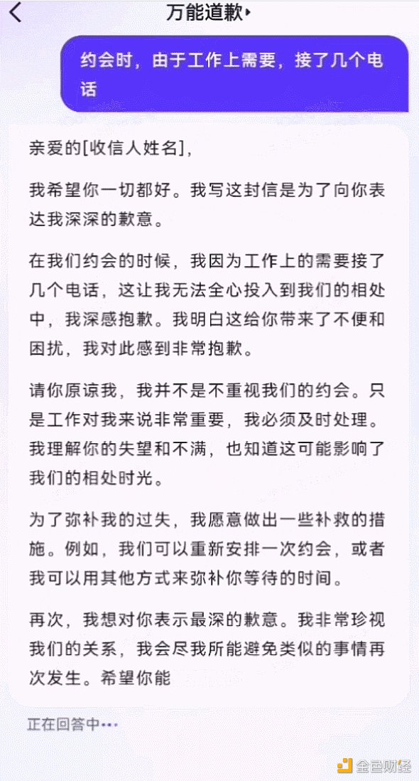 假如你在约会过程中,由于工作上的原因,接了几个电话,事后不知该如何向对方道歉。这时,你只需要简短的输入道歉原因,一封道歉信就呈现在你的面前。
