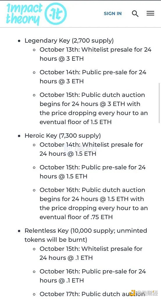 从 2021 年 10 月 13 日到 2021 年 12 月 6 日,Impact Theory 通过发行 NFT 系列「Founder's Keys」从数百名投资者(包括美国各地的投资者)筹集了约 2990 万美元。