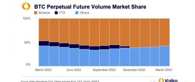 币安多年来一直主导着期货交易量,并且自FTX的崩溃以来,已经连续多次为Kaiko覆盖的所有BTC永续合约的交易量提供了超过一半的交易量。