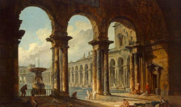 用作公共浴室的古代遗址。休伯特-罗伯特。