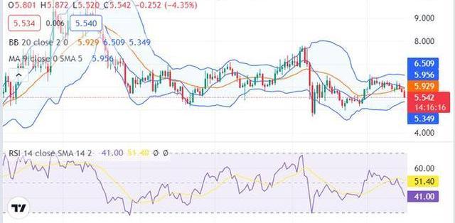 波动性正在增加,这意味着如果卖家保持一致,持续的下跌趋势也可能在接下来的几个小时内延续。与此同时,布林带上轨目前位于6.24美元的高位,而布林带下轨目前位于5.64美元。RSI图表显示一条向下的曲线,分数也已下降至45.25。