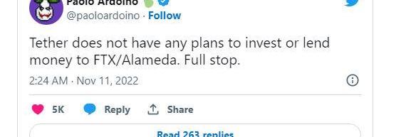 Tether在11月9日的一篇博客文章中表达的情绪向社区保证,它没有接触Alameda或FTX,这似乎反映在CTO的回答中。