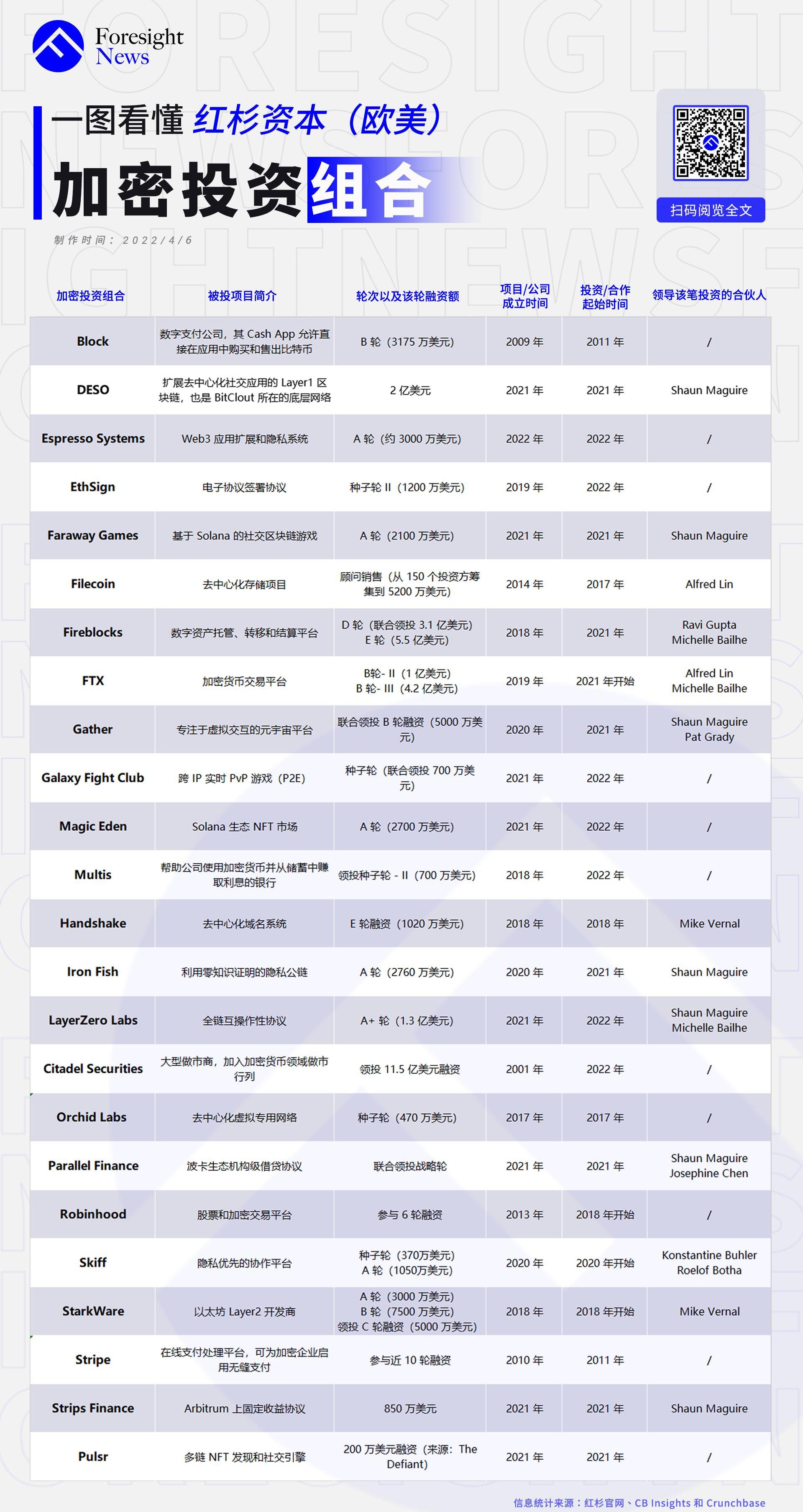 接下来,我们通过官方渠道、Crunchbase、CBInsights、IT桔子、企查查以及其他公开资料整理汇总了红杉三个实体在加密货币领域的投资项目。