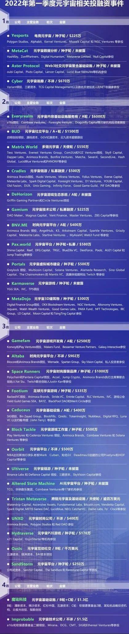 原标题:《今年一季度31家元宇宙企业融资共计4.75亿美元|元宇宙月报·创投通》