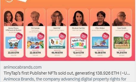 至于这种**改造**能否成功,我个人是持悲观的态度的。唯一能提供的客观信息是Animoca引以为傲的**NFT拍卖**。2022年11月,Animoca联合Tinytap拍卖了6个系列的教育课程NFT,总计卖出22.8万美元,创作者获得11万美元的收入
