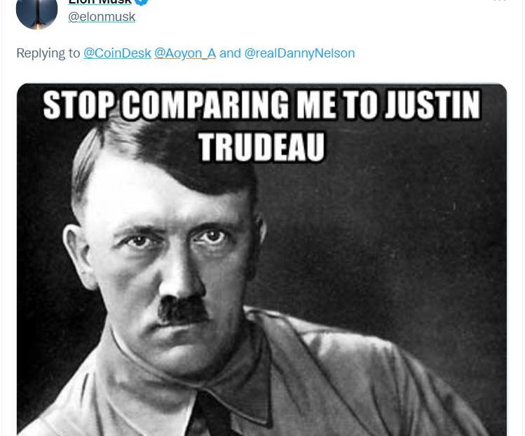 巴比特讯,2月17日,马斯克发图调侃近日加拿大将卡车司机抗议活动相关比特币地址列入黑名单的事件。图片人物为希特勒,并配文“不要把我和JustinTrudeau相提并论”,“我有预算”。