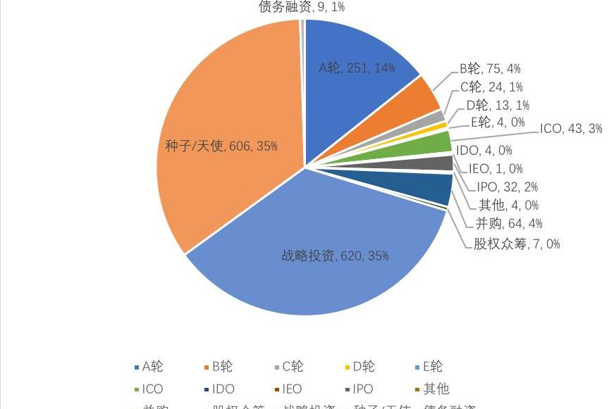 2021年,70%全球区块链产业融资事件为战略投资和种子/天使,二者分别发生620笔、606笔,占比均达近35%。此外,约14%的项目为A轮,B轮发生75起,并购发生64起。