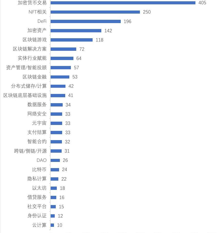 数据来源:01区块链、零壹智库从三级细分场景看,加密货币交易相关项目达405起,NFT相关、DeFi、加密资产、区块链游戏相关项目在融资市场热度颇高,均发生超过100起融资事件。同时,分布式存储/计算、隐私计算、身份认证、云计算等相关赛道也取得了不俗表现,这反映出区块链与其他技术融合的发展趋势。