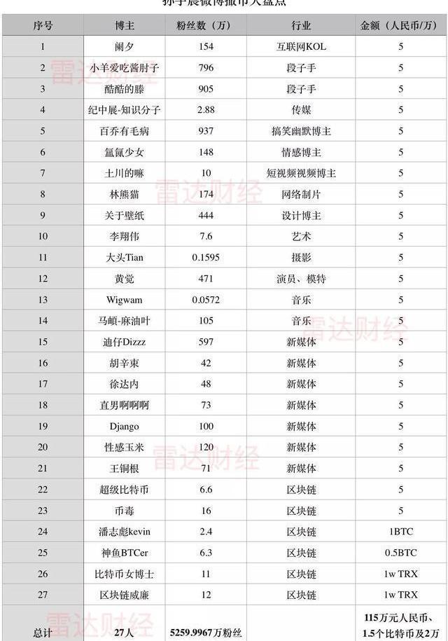 据雷达财经统计,截至发稿,总计有27人收到孙宇晨转账,合计转账金额为115w,另加1.5个比特币和2万波场币。