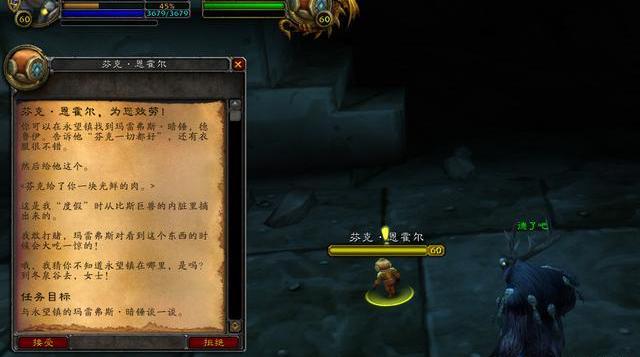 3.跟他对话,接受任务“芬克·恩霍尔,为您效劳”,拿上他从比斯巨兽内脏上摘下来的奇怪的肉,去冬泉谷的永望镇找玛雷弗斯·暗锤吧。