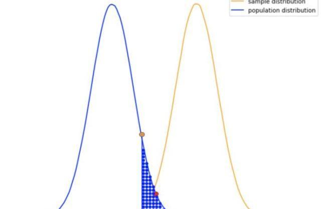 我们可以清楚地看到,人口曲线下方橙色点右侧的面积远大于alpha值。这意味着所获得的结果更可能是同一总体分布的一部分,而不是其他分布的一部分。